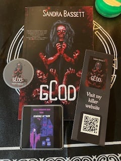 Signed paperback book and a little swag. Leave a message in the comments if you want it personalized.